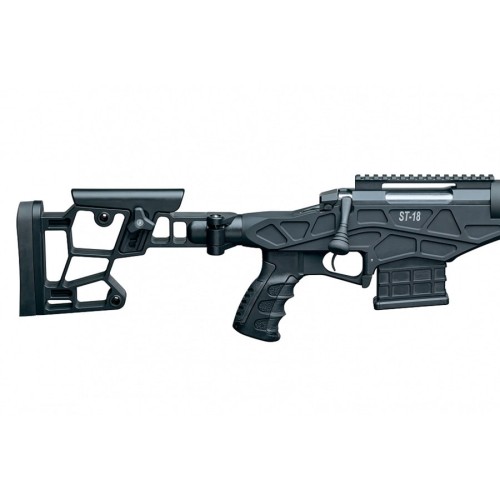 Итальянский холдинг Sabatti имеет многолетнюю историю, в которой неизменным было одно — он всегда производил оружие для пешей охоты, стрелкового спорта, развлечения или самообороны. За все время своего существования продукция итальянской компании полюбилась многим стрелкам из разных уголков планеты. На данный момент Sabatti производит карабины, которые радуют своих владельцев высокой надежностью и качеством исполнения. Линейка карабинов «ST18» является отличным подтверждением всего сказанного. Данная модель использует патроны калибра .308 Win. Ствол был оснащен трехкамерным дульным тормозом-компенсатором. Установленный ударно-спусковой механизм имеет уникальный продольно-скользящий затвор от Mattia Molina BCM. Объемный магазин со встроенной кнопкой для быстрой смены обоймы способен вместить в себя вплоть до 8 патронов за один раз. Для смены магазина достаточно снять используемую обойму и, либо вручную дозарядить её зарядами, либо заменить её на готовый к дальнейшей работе вариант. Складной приклад из фирменного материала Ryton имеет регулировку затыльника и подщечника. На пистолетную рукоятку с вырезами под пальцы нанесено гравированное покрытие для улучшения охвата карабина во время стрельбы. Цевье формата AR с планками «Пикатинни» подойдет как для установки оптического прицела, так и для сошек. Длина ствола 650 мм. Удельный вес составляет 4,9 кг.