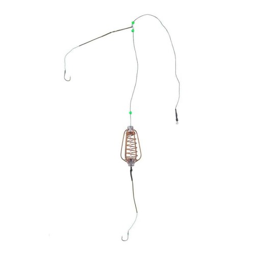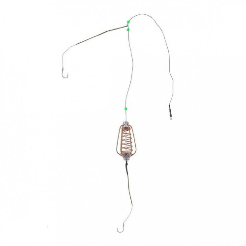 "В оснастке используются крючки производства Hayabusa — № 2, № 4 и № 6. Груз-кормушка 45 гр. Применяется в прудах и реках без течения. Оснастка предназначена для ловли крупных карповых рыб: карп, сазан, амур, линь, карась, язь, лещ. Кормушка оснащается прикормом. Насадка для нижнего поводка — кукуруза, червь или тесто. Насадка для отводного поводка — кукуруза или червь."