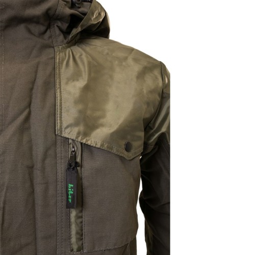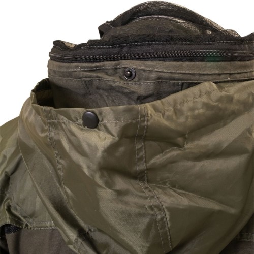 Удлиненная куртка на разъемной молнии регулируется эластичным шнуром по талии. Центральная молния закрыта ветрозащитной планкой. Капюшон с отстегивающейся антимоскитной сеткой регулируется эластичным шнуром. Рукава на манжетах. Штаны с высоким поясом со шлевками под ремень и отстегивающимися подтяжками. 6 карманов. Низ брюк на трикотажных манжетах. Специальные накладки в области локтей и колен со съемными вставками из пенополиуретана. Основные элементы костюма усилены вторым слоем непромокаемой ткани.